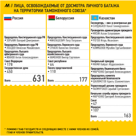 На ближайшей встрече в рамках комиссии Таможенного союза главы правительств России, Белоруссии и Казахстана подпишут соглашение об освобождении от личного досмотра багажа высших чиновников трех стран. «Маркер» ознакомился с согласованной версией этого документа. Там есть любопытные моменты. Например, в список льготников включаются не только действующие, но и бывшие президенты государств–членов Таможенного союза. А круг освобождаемых от личного досмотра казахских чиновников гораздо шире, чем российских и белорусских. Этот момент вызвал удивление даже в российском МИДе.