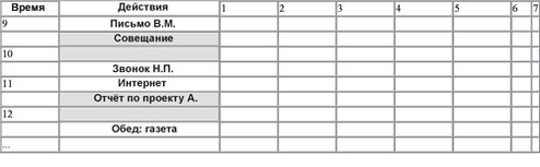 Выберите точность учета — для начала рекомендуем 15 или 30 минут. В каждую клетку левого столбца вам нужно будет записать содержимое соответствующего отрезка дня. Лучше начинать с тех дел, которые вы помните хорошо, с тех событий, время начала которых сильно запечатлелось в памяти. Вслед за ними можно восстанавливать то, что запомнилось хуже, вспоминая логические связи между событиями, используя разные каналы памяти (представьте себе зрительно картину происходившего, вспомните звуки и слова, и т.д.). Можно привлечь записи в органайзере, и т.д. Если некоторые части дня вспоминаются очень плохо — отметьте их галочками в 1 столбце. Соответствующие "белые пятна" можно просто не учитывать в дальнейшем анализе, а можно заполнить типичными делами, которые обычно случаются в это время.
