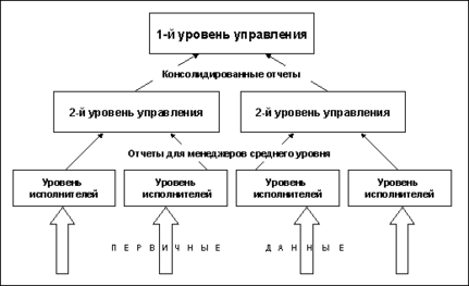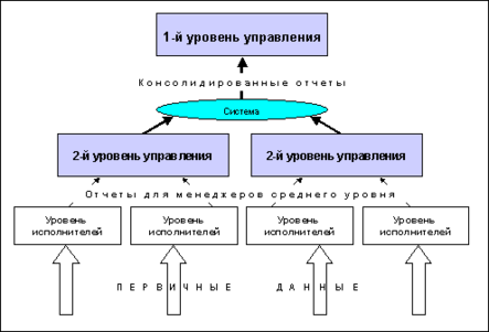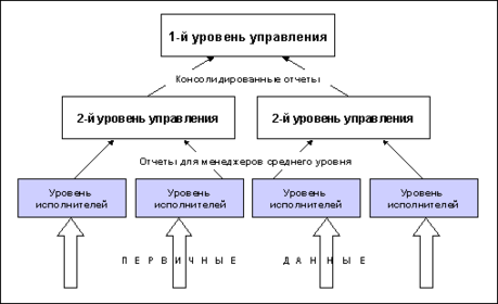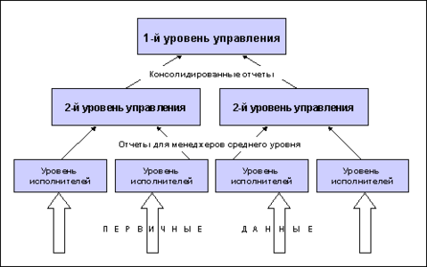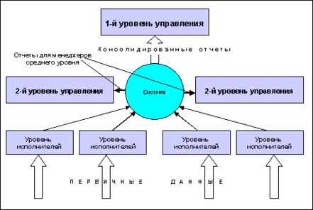 уществует несколько подходов к внедрению информационной системы в работу предприятия.2 Для рассмотрения двух из них будет использоваться пример организации, имеющей три уровня иерархии: уровень исполнителей и два уровня управления (рис. 3).