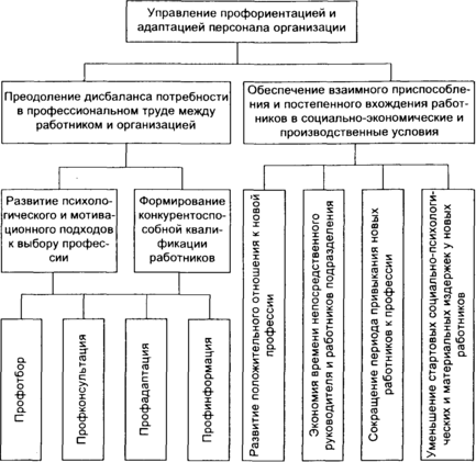 В то же самое время многие другие авторы, и с их мнением, по-видимому, стоит согласиться, считают профориентацию одним из этапов адаптации. Рассматривая адаптацию как процесс знакомства сотрудника с деятельностью и организацией и изменение собственного поведения в соответствии с требованиями среды, эти авторы включают понятия «введение в должность» и «профориентация» во всеобъемлющий процесс «первого уровня» — адаптацию.