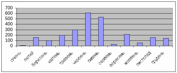 Як бачимо, максимальний обсяг виробництва приходиться на червень і складає 610,2 тис. грн. Це пов’язане з сезонністю самого сільського господарства. Тобто інтенсивні роботи по підготовці до збирання врожаю йдуть саме в цей період.
