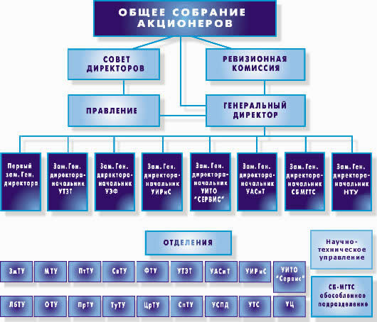 В этой главе я попробую проанализировать и сравнить теорию моего курсового проекта с тем, что я выявил в компании, общаясь с сотрудниками аппарата управления а также с сотрудниками отдела «по работе с резервами». Чтобы понять, как происходят коммуникации в «МГТС», рассмотрим структуру управления этой компании. И так, ОАО "МГТС" имеет двухуровневую структуру управления. Высшим органом управления является общее собрание акционеров. На годовом общем собрании акционеров избирается Совет директоров и Ревизионная комиссия. Совет директоров осуществляет общее руководство деятельностью. Руководство текущей деятельностью осуществляет Генеральный директор и Правление. Правление возглавляет Генеральный директор, который назначается общим собранием акционеров сроком на 5 лет.