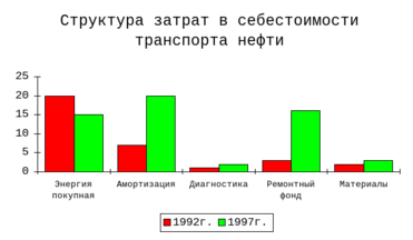 Удельный вес анализируемых затрат в общих затратах на транспорт нефти вырос 32,54% (1992г.) до 54,64% (1997г.), т.е. более чем на 22%. При этом отмечается рост затрат по всем статьям, кроме статьи “Энергия покупная”. Снижение удельного веса затрат по этой статье объясняется тем, что эти затраты зависят от объемов перекачки нефти, а, как уже отмечалось выше, объем перекачки нефти за анализируемый периодснизился на 26,1%.