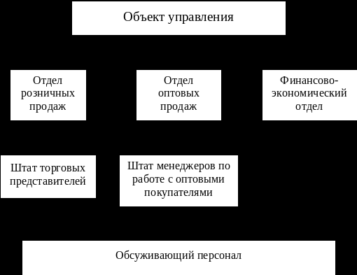 Для рассматриваемой фирмы ООО «Яркий свет» основу управления составляют отношения найма. В этой фирме собственник имеет возможность командовать, в связи с тем, что он, открывая производителю доступ к средствам производства, выступает в роли хозяина и нанимателя производителя. Субъектом управления в этой ситуации является собственник предприятия, а объектом управления является штат наемных сотрудников предприятия. Объект управления представляет собой структурированную группу сотрудников организации, схематично представленную на рисунке 1.