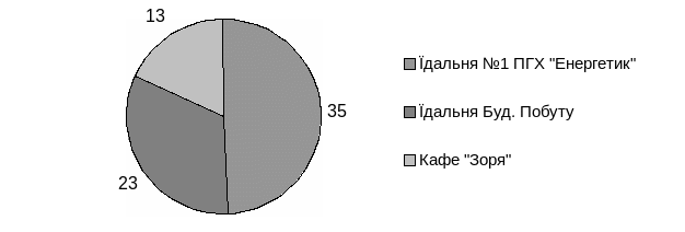 Аналізуючи таблицю, ми можемо зробити висновок, що більшим попитом в даний проміжок часу у споживачів користувалася їдальня № 1 ПГХ «Енергетик». В ній було зайнят 35% загальної кількості місць. В їдальні Будинку побуту і кафе “Зоря” було зайнято лише 9 і 4% місць відповідно.