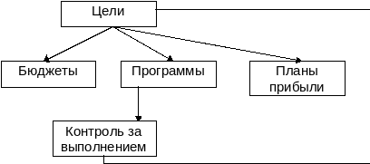 В системе долгосрочного планирования (рис. 1) цели претворяются в программы действий, бюджеты (годовой план), планы прибылей, разрабатываемые для каждого из главных подразделений предприятия. Затем программы и бюджеты выполняются этими подразделениями и определяются отклонения фактических показателей от запланированных.
