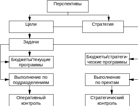 Как видно из схемы (рис. 2), перспективы и цели связаны между собой для выработки стратегии. Текущие программы (бюджеты) ориентируют оперативные подразделения предприятия в их повседневной работе, направленной на обеспечение текущей рентабельности; стратегические программы и бюджеты закладывают основы будущей рентабельности, что требует создания специальной системы исполнения, построенной на управлении проектами.