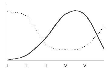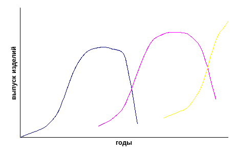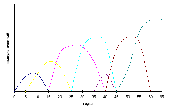 Особенность жизненного цикла развития техники состоит в том, что новое поколение машин начинает осваиваться, когда предыдущее поколение находиться в 4 фазе. Т.е. новый продукт в производство необходимо вводить в период фазы зрелости предыдущего продукта. В противном случае не может быть обеспечена непрерывность технического прогресса, развития производительных сил, нечем будет заменить устаревшую технику. Обычно 5 фаза предыдущего жизненного цикла примерно совпадает во времени с третьей фазой следующего. Техника нового поколения, становясь массовой, начинает определять возросший технический уровень и новый уровень стоимости продукции. Лишь при этом условии выпускавшиеся прежде машины становятся технически и морально экономически устаревшими и подлежат возможно более быстрой замене. Обращает на себя внимание известный "провал" в производстве при переходе от одного поколения техники к другому. Это период, когда старая техника, находящаяся в последней фазе цикла, уже не дает эффекта, а новая, находящаяся в первой – второй – начале третьей фазах, пока еще дает мало эффекта. Чем короче этот переходный период, тем меньше потери для общества от перестройки сферы производства и применения техники при переходе к новому ее уровню.