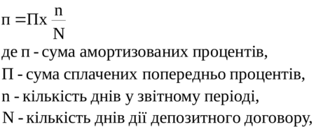 1. Якщо проценти сплачені авансом, то в останній робочий день місяця на протязі терміну дії депозитного договору банк здійснює амортизацію сплачених процентів за наступною формулою: