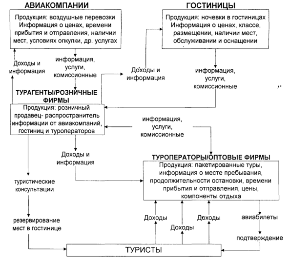 Однако выделяется одна особенность — связующим центром, удерживающим различных производителей в рамках туристической отрасли, является информация. Именно информационные потоки, а не товары обеспечивают связи между производителями туристических услуг; они идут не только в виде потоков данных, но выступают также в форме услуг и платежей.