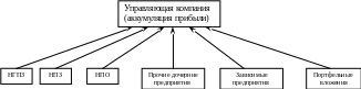 Холдинговая структура крупной российской компании обычно носит «зонтичный характер», то есть, предполагает существование управляющей компании (холдинга) и ряда дочерних предприятий (см. рис. 6.). как правило, управляющая компания является центром аккумуляции прибыли всего через механизм трансфертных цен, что позволяет проводить единую инвестиционную политику. Дочерние предприятия в этих условиях работают в режиме простого воспроизводства, то есть покрывают расходы, связанные с осуществлением текущей деятельности.