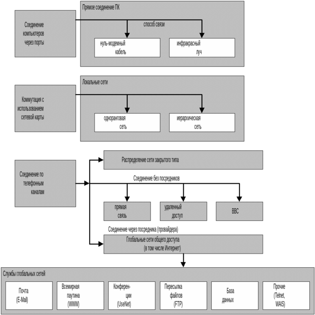 Рисунок 13 - Способы коммутации компьютеров и виды сетей.