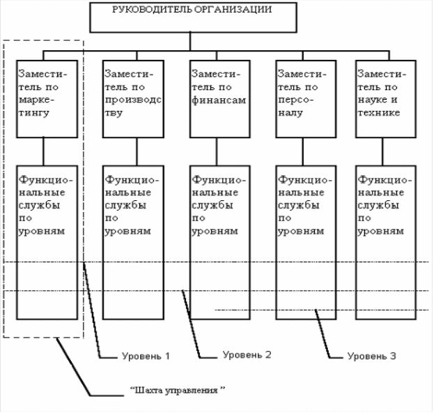 Основы линейных структур составляет так называемый "шахтный" принцип построения и специализация управленческого процесса по функциональным подсистемам организации (маркетинг, производство, исследования и разработки, финансы, персонал и т. д. ). По каждой подсистеме формируется иерархия служб ("шахта"), пронизывающая всю организацию сверху донизу (см. рис. 1.3.). Результаты работы каждой службы оцениваются показателями, характеризующими выполнение ими своих целей и задач. Соответственно строится и система мотивации и поощрения работников. При этом конечный результат (эффективность и качество работы организации в целом) становится как бы второстепенным, так как считается, что все службы в той или иной мере работают на его получение.