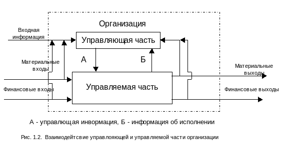 Процесс управления предусматривает согласованные действия, которые обеспечивают осуществление общей цели или набора целей, стоящих перед организацией. Для координации действий должен существовать специальный орган, реализующий функцию управление. Поэтому в любой организации выделяется управляемая и управляемые части. Схема взаимодействия между ними показана на рис. 1.2 (7)