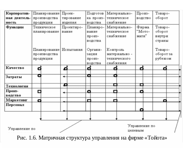 Такая структура представляет собой сетевую структуру, построенную на принципе двойного подчинения исполнителей: с одной стороны - непосредственному руководителю функциональной службы, которая предоставляет персонал и техническую помощь руководителю проекта, с другой - руководителю проекта или целевой программы, который наделен необходимыми полномочиями для осуществления процесса управления. При такой организации руководитель проекта взаимодействует с 2-мя группами подчиненных: с постоянными членами проектной группы и с другими работниками функциональных отделов, которые подчиняются ему временно и по ограниченному кругу вопросов. При этом сохраняется их подчинение непосредственным руководителям подразделений, отделов, служб. Для деятельности, которая имеет четко выраженное начало и окончание, формируют проекты, для постоянной деятельности - целевые программы. В организации и проекты, и целевые программы могут сосуществовать. Пример матричной программно - целевой структуры управления (фирма "Тойота") приведен на рис. 1.8. Эта структура была предложена Каори Ишикава в 70-х годах и с небольшими изменениями функционирует по сей день не только на фирме "Тойота", но и на многих других фирмах по всему миру.