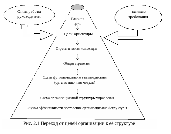 осле разработки развёрнутой во времени последовательности целей ориентиров необходимо определить стратегическую концепцию организации. Правильный выбор стратегии позволяет перейти к следующему этапу организационного проектирования – к созданию организационной структуры. На рис. 2.1 показана последовательность действий перехода от цели организации к организационной структуре управления с последующей оценкой эффективности построения этой структуры (9).