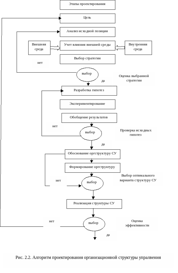 Выполнение всех этапов организационного проектирования должно сопровождаться экономическим анализом, учитывающим как ресурсные возможности организации, так и потребности внешней среды. Поскольку проектирование организации определяет её будущее и последовательность её развития, все этапы проектирования предусматривают проведение вычислительных экспериментов с использованием процедур моделирования. В частности, цель, определяемая на первом этапе проектирования, - это исходная модель будущего состояния организации. Другие элементы модели организации могут быть представлены в виде развёрнутого алгоритма. Отражающего последовательность действий на этапах организационного проектирования (см. рис. 2.2).