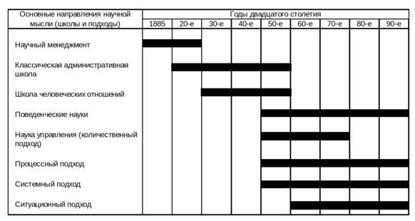 В развитии научных подходов в менеджменте можно выделить ряд основных направлений управленческой мысли, каждое из которых стало существенным этапом в ее эволюции. Это научный менеджмент, классическая административная школа, школа человеческих отношений, поведенческие науки, количественный подход, системный подход, ситуационный подход. Хронологическая последовательность развития теории и практики менеджмента в ХХ в. представлена на рисунке (см. Рис. 1.)