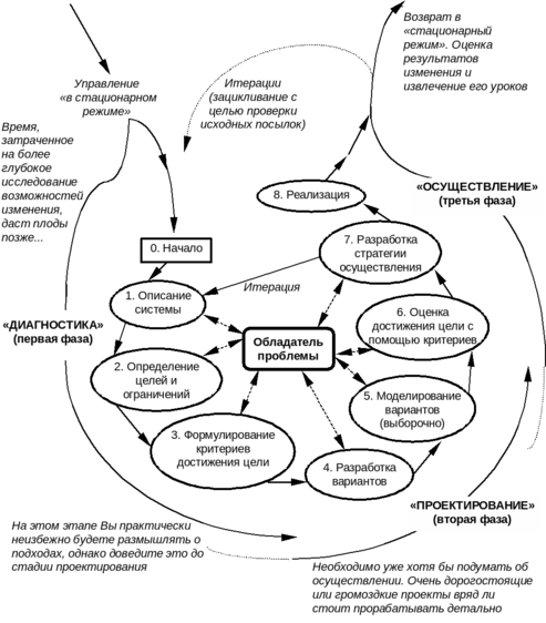 При данном подходе перед проведением всей работы определяется Обладатель проблемы - отдельное лицо или группа лиц, перед которыми возникла проблема, также формируется рабочая группа, выполняющая всю работу.Последовательность шагов, которые должна пройти рабочая группа, контактируя с обладателем проблемы, приведена на Рис. 3.