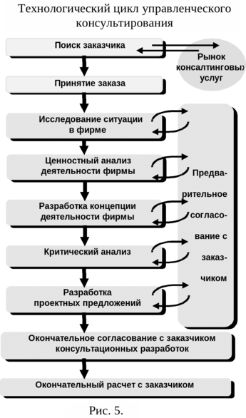 Однако даже такое, достаточно подробное рассмотрение типов проблем, которые вызывают необходимость анализа систем управления предприятием, все же скрывает сами методы, критерии которыми пользуются профессиональные консультанты. Абстрактный ответ на этот вопрос легко позволит получить реконструктивный анализ технологии работы консультантов, а в широком смысле – аналитиков систем управления. Рисунок технологического цикла управленческого консультирования приведен на рисунке (см. Рис. 5)