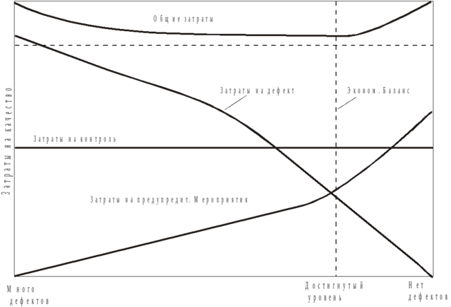 Взаимосвязь между всеми затратами на качество, общими затратами на качество и уровнем достигнутого качества обычно представляют так, как это показано на рисунке :