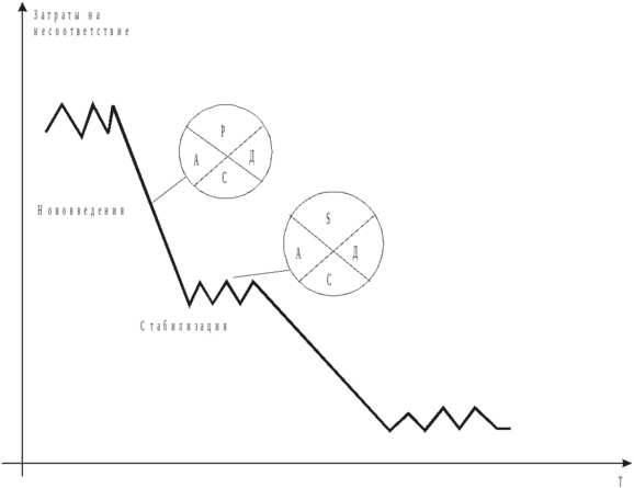 Четвертый этап – удержание достигнутых результатов: проверка эффективности результатов внедрения, регулярное сравнение достигнутых результатов с запланированными. Основная задача этого этапа заключается в станартизации нового решения на уровне подразделения. Непрерывное улучшение качества может быть осуществлено так же, если руководствоваться циклом Деминга. Цикл Деминга известен по аббревиатуре РDСА (планирование, выполнение, проверка, введение норм).