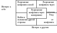 Разрешение конфликта силой: выбирая его, следует отметить, что он характеризуется большой личной вовлеченностью и заинтересованностью в его устранении, но без учета интересов другой стороны. Для его применения необходимо обладать властью или силой.
