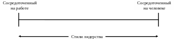 Сравнивая группы с высокой и с низкой производительностью труда в различных организациях можно сказать, что разницу в производительности объясняет стиль лидерства. Оказалось, что стиль управления, сосредоточенный на человеке, из-за характера ситуации часто не способствовал повышению производительности труда и не всегда являлся оптимальным поведением руководителя. Аналогично континууму по теориям «Х» и «У» МакГрегора руководители групп с высокой и низкой производительностью классифицировались по континууму, находящемуся в пределах от одной крайности – сосредоточенные на работе (теория «Х») до другой – сосредоточенные на человеке (теория «У»). Этот континуум представлен на рис. 4.