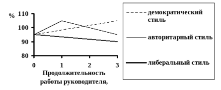 Влияние стилей управления на эффективность работы групп в течение продолжительного времени исследовали и немецкие ученые. Было установлено, что результативность труда постоянно повышалась у коллектива, где преобладал демократический стиль руководства, снижение эффективности – у коллектива с либеральным и авторитарным стилем [3, c. 112].