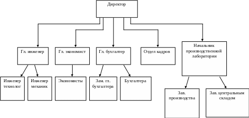 В подчинении директора находятся главный бухгалтер (заместитель главного бухгалтера, бухгалтера); отдел кадров; главный экономист (экономисты); главный инженер (инженер-технолог, инженер-механик); начальник производственной лаборатории (зав. производства, зав. центрального склада).