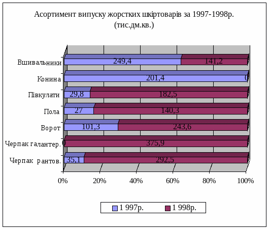 ßê âèäíî ç äàíèõ òàáëèö³, ìàþòü ì³ñöå ñóòòºâ³ çì³íè â àñîðòèìåíò³ ïðîäóêö³¿. Çîêðåìà, íà 22% çìåíøèâñÿ âèïóñê õðîìîâèõ øê³ðòîâàð³â, á³ëüø í³æ â 2 ðàçè çá³ëüøèâñÿ âèïóñê æîðñòêèõ øê³ðòîâàð³â. Ðàçîì ç òèì ð³çêî çìåíøèâñÿ âèïóñê ñï³ëêó, âåò-áëþ ³ç ñèðîâèíè ñâèíåé. Á³ëüø äåòàëüíî ñòðóêòóðí³ çì³íè ó âèïóñêó æîðñòêèõ øê³ðòîâàð³â â³äîáðàæåí³ íà мал. 4.