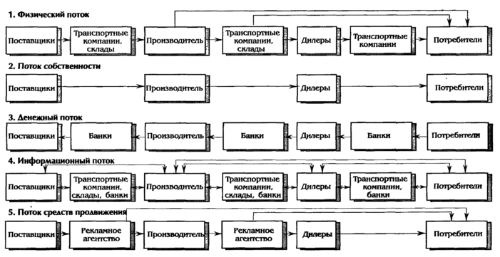 На рис. 5 представлены пять таких потоков, возникающих при продажи грузоподъемников. Все они представлены на одной диаграмме и помогают понять, насколько сложны даже самые короткие каналы распределения.