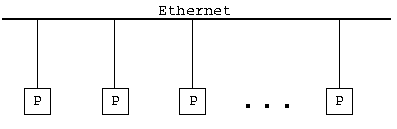 В качестве физической архитектуры параллельного компьютера используется локальная сеть LAN Ethernet. Таким образом, параллельный компьютер состоит из некоторого количества процессоров P, соединенных между собой линией передачи данных.
