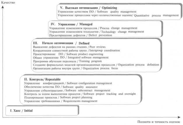 | V. Высокая оптимизация | Управление процессами через количественные оценки | Управление качеством ПО | |