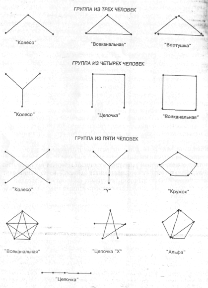 Существуют устоявшиеся образцы коммуникационных сетей для групп одной и той же или разной численности (рис. 3). В сетях типа «кружок» члены группы могут коммуницировать только с теми, кто расположен рядом с ними.