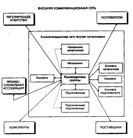 Создаваемая руководителем сеть состоит из вертикальных, горизонтальных и диагональных связей. Вертикальные связи строятся по линии руководства от начальника к подчиненным. Горизонтальные связи осуществляются между равными по уровням индивидами или частями организации: между заместителями, между начальниками отделов, между подчиненными. Диагональные связи — это связи с другими начальниками и с другими подчиненными. Сеть этих связей создает реальную структуру организации. Задача формальной организационной структуры заключается в том, чтобы придать коммуникационным потокам правильное направление. Размеры подразделений в организации ограничивают возможности развития коммуникационной сети. Если размер группы увеличивается в арифметической прогрессии, то количество возможных коммуникационных отношений возрастает по экспоненте. Отсюда коммуникационная сеть в группе из 12 человек более разнообразная и сложная, чем в группе из трех человек. В зависимости от того, как построены коммуникационные сети, деятельность группы может отличаться большей или меньшей эффективностью.