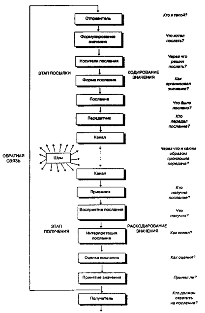 Последним важным элементом коммуникационного процесса является обратная связь, появляющаяся в результате обмена участников процесса ролями. Получатель становится отправителем, и наоборот, отправитель — получателем. Таким образом, весь цикл повторяется вновь, но уже в другом направлении. Обратная связь - это ответ