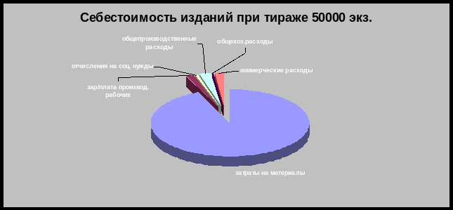 На диаграммах можно наблюдать, что при увеличении тиража издания в составе себестоимости единицы значительно снижается часть общепроизводственных и общехозяйственных затрат, а также оплата производственным рабочим. Коммерческие расходы при этом свою долю в себестоимости не утратили за счет их увеличения прямо пропорционально увеличению тиража. Затраты на материалы значительны при малых тиражах.