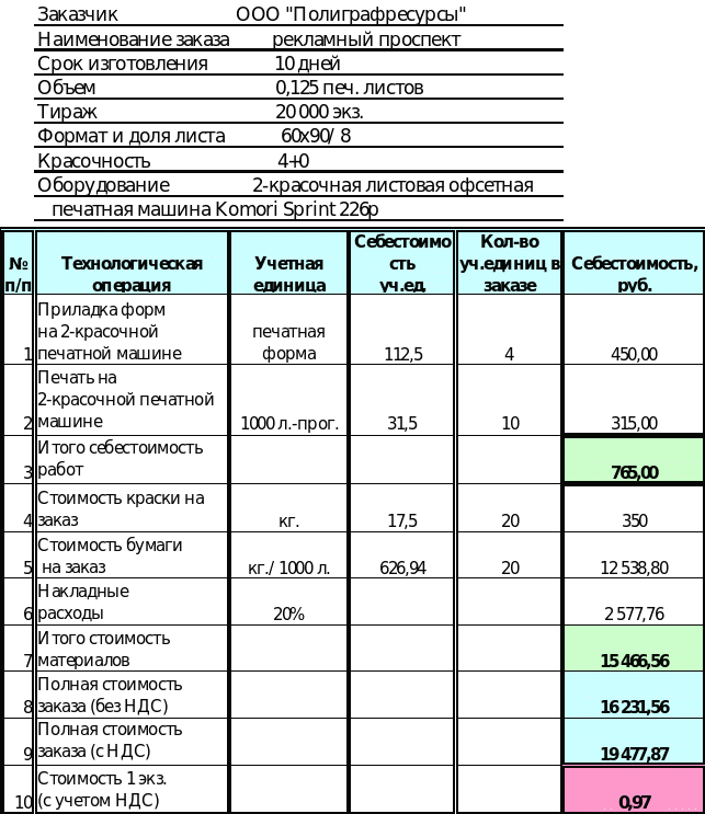 Из технологической карты заказа можно определить себестоимость 1 учетной единицы продукции. 16 231,56 / 20 000 = 0,81 руб. (без учета НДС). Таким образом, себестоимость рекламного проспекта в печатном отделении типографии равна 81 коп.