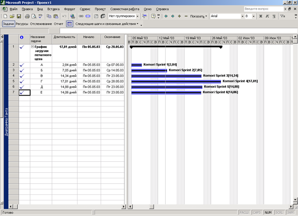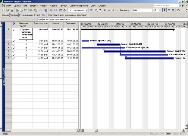 Для выполнения графика плана-загрузки необходимо установить параметры проекта: длительность работ, назначить используемые ресурсы, способ планирования, вид связи работ, приоритет работы, календарь рабочего времени, единицы измерения длительности и объем работ. Предположим, что на предприятии имеется достаточное количество оборудования для печати одного вида издания на одной офсетной печатной машине Komori Sprint 226. Тогда, срок исполнения всех заказов при двухсменном режиме работы будет равен 17,81 дней, при этом будет задействовано 6 единиц оборудования и 12 печатников офсетной печати: 6 печатников VI разряда и 6 печатников офсетной печати IV разряда, отсюда следует, что коэффициент загрузки производственного оборудования будет низким.