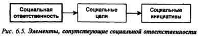 Социальная ответственность возникает при выполнении служебных, семейных, гражданских, общественных и личных обязанностей. Она отражает склонность личности придержи­ваться в своем поведении общепринятых в обществе социаль­ных норм и отвечать за результаты их исполнения. Примером может служить «Клятва Гиппократа» — общепринятая норма социальной ответственности для врачей перед пациентами. Социальная ответственность может быть индивидуальной, групповой и общественной. Она неразрывно связана с реали­зацией социальных инициатив в рамках принятых социальных целей (рис. 6.5).