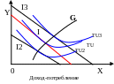 График «Доход-потребление» показывает, что с ростом дохода (бюджета), потребитель может позволить большее количество товаров с максимальной полезностью более высокого уровня, например TU3. Линия G , это кривая Энгеля, которая показывает изменение максимального возможного оптимального потребления в зависимости от дохода.