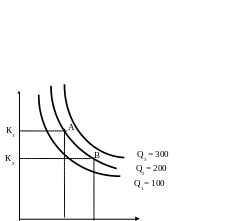 Уровень выпуска Q2=200 может быть получен, например, двумя технологическими способами - применяя L1 и К1 единиц труда и капитала (точка А), или же применяя L2 и К2 единиц труда и капитала (точка В). Наклон изоквант в каждой технологической точке называется предельной нормой технического замещения - MRTS.
