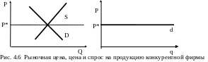 Спрос на продукцию фирмы абсолютно эластичен на уровне равновесной рыночной цены P* (Рис.4.6. S,D - отраслевые спрос и предложение, d - спрос фирмы).