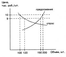 Оценить соотношение спроса, предложения и цен можно с помощью кривых спроса и предложения. Кривые спроса и предложения - это графическое изображение зависимости объемов сбыта и производства продукции от уровня цен. Рассмотрим построение кривых спроса и предложения на условном примере. Предположим, что при цене 10 000 руб. объем спроса составляет 100 единиц продукции, а объем предложения - 200 единиц. Снижение цены на 1 000 руб. привело к увеличению спроса до 120 единиц продукции и к снижению объемов производства на 190 единиц. Как показывает рис.1, снижение цены не достигло точки равновесия (точки равенства спроса и предложения), и на рынке сохранилось состояние перепроизводства.