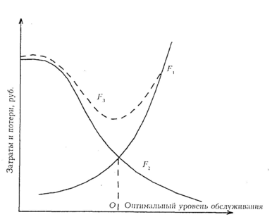 Графически оптимальный размер уровня сервиса определяют суммарной кривой F3, отражающей поведение затрат и потерь в зависимости от изменения уровня обслуживания.