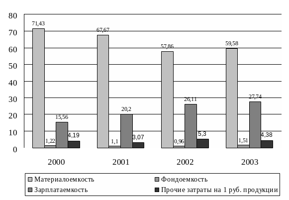 Из анализа графика видно, что материалоемкость имеет устойчивую тенденцию к снижению, за период с 2000 по 2003 гг. общее снижение составило 11,85 %, что является хорошим фактором.