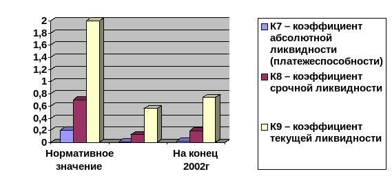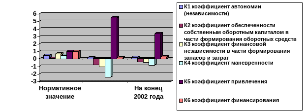 | Коэффициент | Нормативное значение | На конец 2001 года | На конец 2002 года | Изменение +/- |