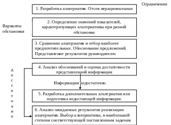 Первым шагом является разработка возможных альтернатив выполнения задачи и отсев нерациональных. Затем для каждой альтернативы определяются значения характеризующие ее показателей: степень выполнения задачи, ожидаемые затраты, предполагаемый срок выполнения задачи и т.п. После этого альтернативы сравнивают, отбирают наиболее предпочтительные и представляют руководителю. В материалах, подготовленных для руководителя, обычно содержатся обоснования, приводимые в подтверждение выводов специалистов о предпочтительности предложенных сочетаний целей. Руководитель рассматривает представленные ему варианты и выбирает один из них для реализации. В этом случае решение принято. Если руководитель не сочтет обоснования убедительными, он дает специалиста задание рассмотреть дополнительные варианты или подготовить недостающую информацию. В этом случае процесс принятия решения продолжается.