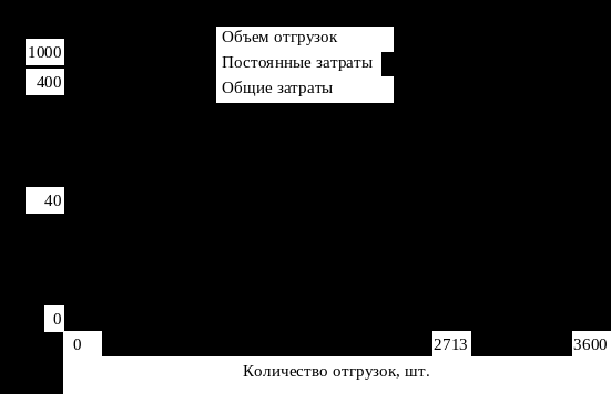 Для определения точки безубыточности графическим методом, представленной на рисунке 6, необходимо построить графики объема отгрузок, вместе с постоянными и общими затратами. Для построения графика линейной функции достаточно определить две точки. Результаты расчетов представлены в таблице 18: